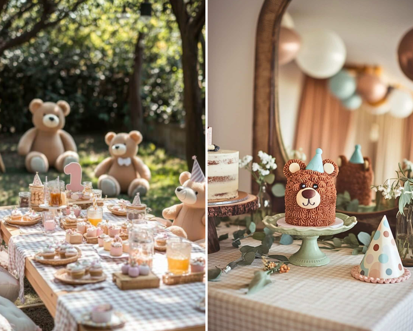 A teddy bear-themed party brings cuddly comfort to the celebration. Soft browns, honey-colored accents, and plush bear décor create a cozy, heartwarming vibe for your little one’s big day.
